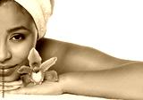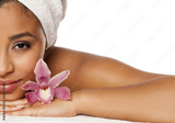 portrait of young beautiful dark-skinned woman with orchid lying on a white background
