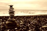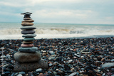 relaxation at sea. Stack of stones on beach - nature background. Stone cairn on green blurry background, pebbles and stones