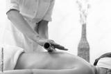 Relaksacyjny masaż bambusem. Masażysta masuje ciało przy użyciu bambusowych kijów.