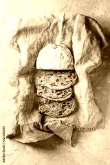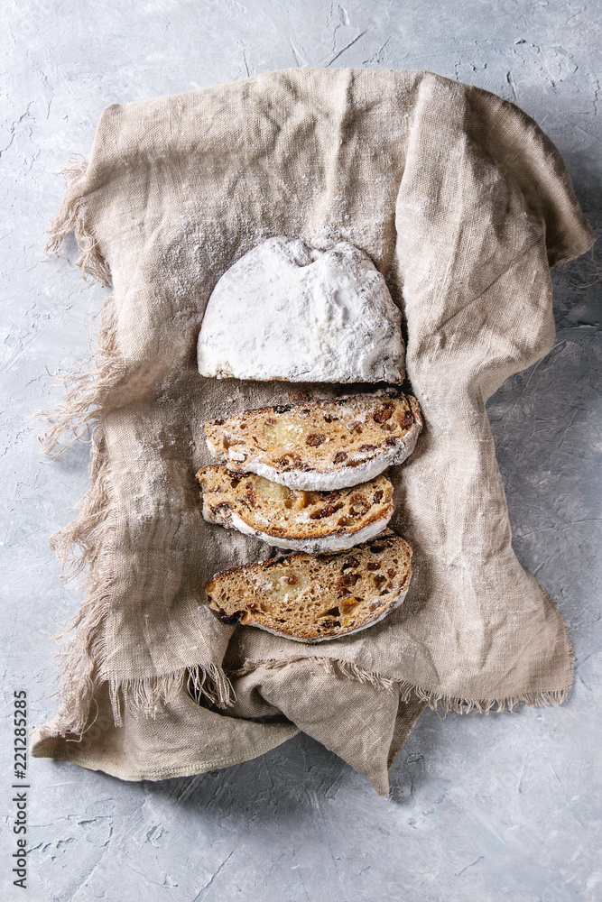 Sliced Christmas cake, traditional German festive baking. Wholegrain stollen with raisins and sugar powder on linen napkin over gray texture background. Top view, space