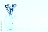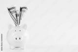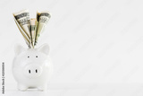 America dollars banknotes money into piggy bank on white background. Saving money wealth and financial concept.