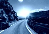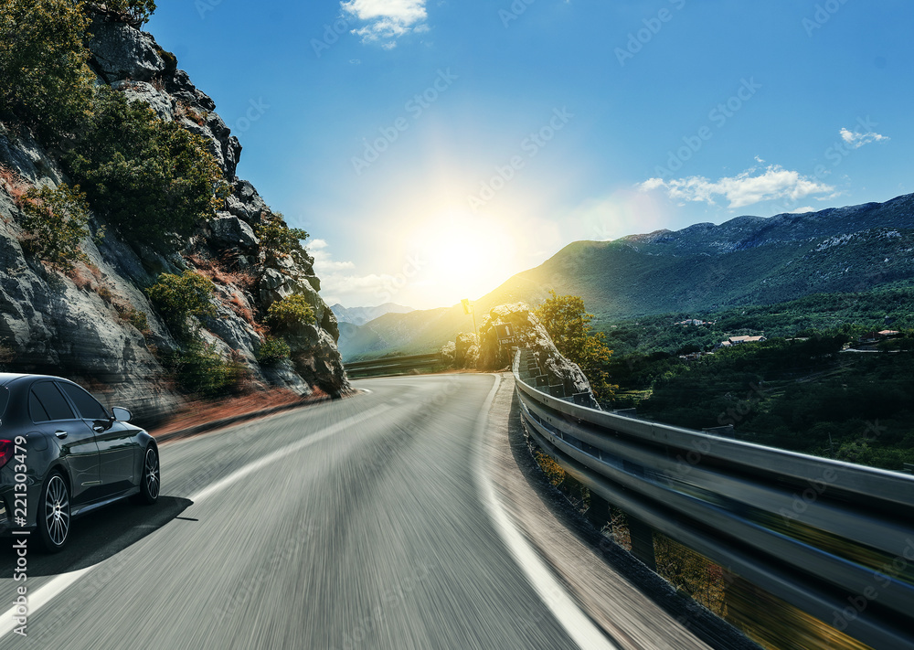 Black car rushing along a high-speed highway in the sun.