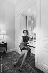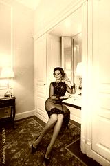 Sexy and fashionable young long legged business lady with bright makeup and with trendy hairstyle, in stylish dress sits on a chair and posing at luxury vintage interior