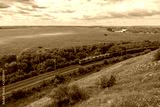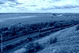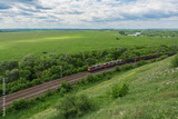 Freight train with locomotives passing by rail in Russia, along the typical Russian landscape, top view