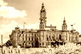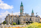 Town hall in Györ in northwest Hungary with city bike stand in foreground