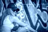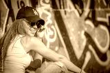 Portrait of young beautiful woman wearing white tank shirt and blue jeans and black hat on brick wall with graffiti background