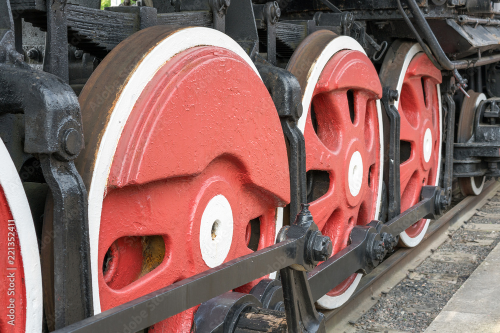 Red large iron wheels of an old vintage locomotive on railroad close-up. Wheels of a locomotive. Large wheels.