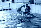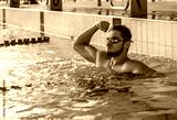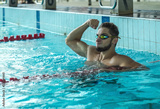 Swimmer man. Happiness swimming athlete in goggles after distance