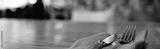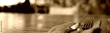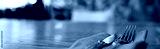 serving in the restaurant, fork and knife / interior view of the restaurant with a table served knife and fork on the table in a cafe