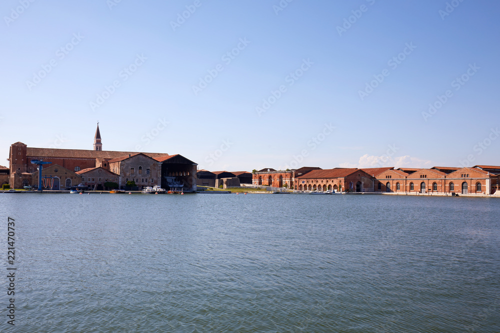 Venetian Arsenal shipyard, canal and industrial red bricks buildings in a sunny day in Venice, Italy