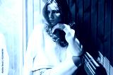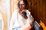 young beautiful woman in a white sweater and gray knee socks looks out the window on a wooden background