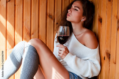 young beautiful woman in a white sweater and gray knee socks drinking red wine on a wooden background