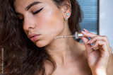young beautiful curly woman uses serum for face. The concept of facial skin care.