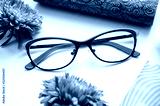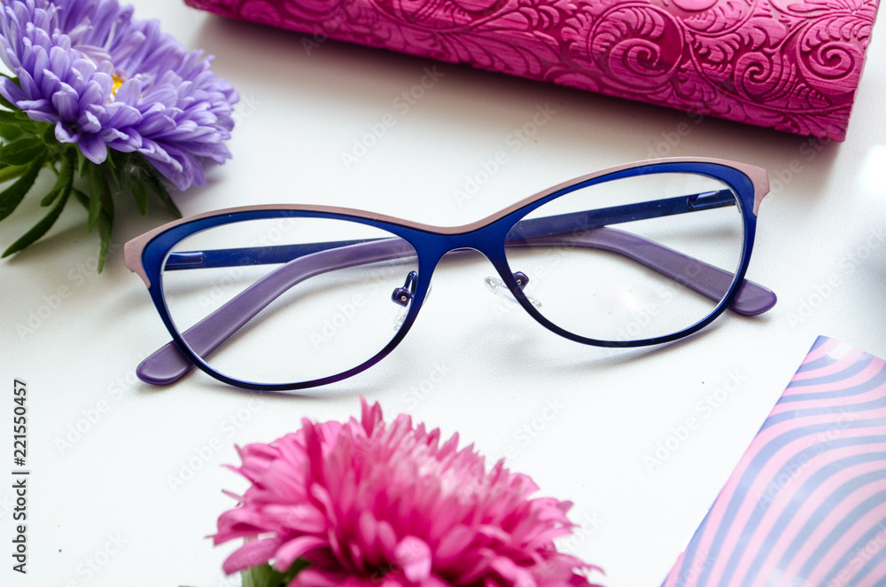 Purple stylish glasses with flowers and a pink case on white background. Flying, top view