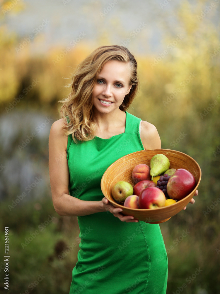 Kobieta w zielonej sukience trzymająca misę z owocami