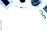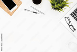 White office desk table with laptop, smartphone and office supplies. Top view with copy space, flat lay.