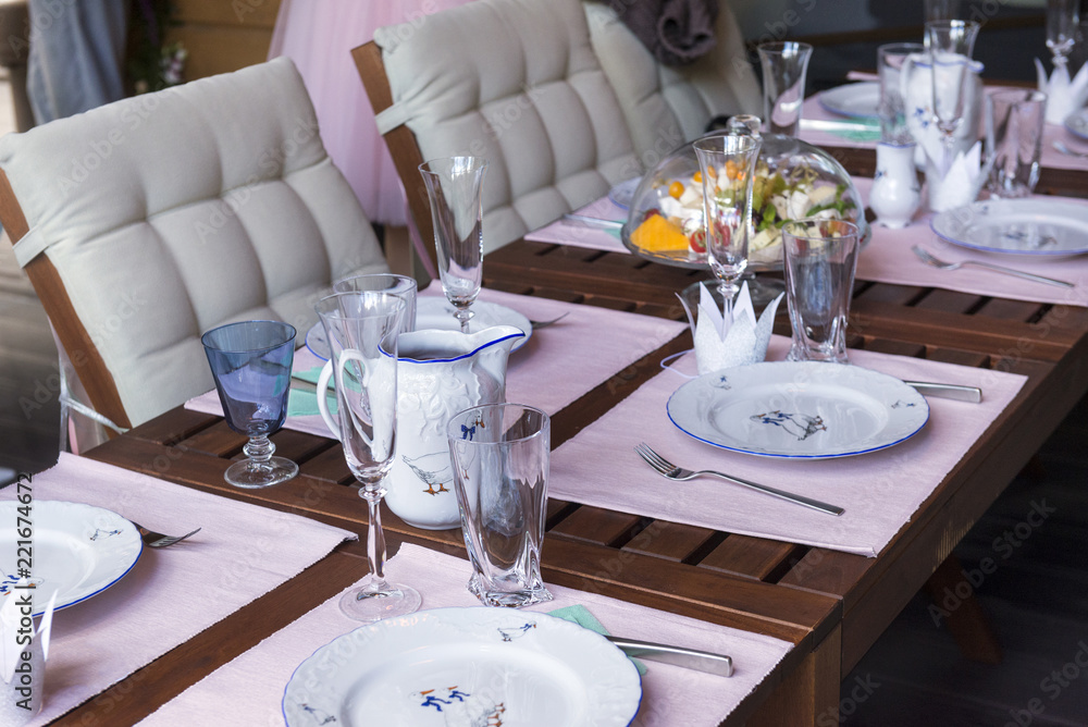 wooden table served with napkins, plates, glasses, Cutlery, glasses, festive dining table