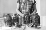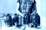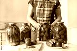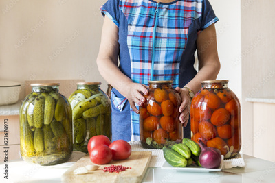 woman in the kitchen next to the table. on the table are banks with pickled, salted tomatoes and cucumbers, on the table fresh tomatoes, cucumbers, onions, garlic, vegetables