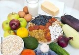 useful diet food, milk, a glass, oatmeal, oatmeal, fruit, apples, avocado, vegetables, tomato, cucumber, zucchini, garlic, eggplant, eggs, lemon, dry fruits, dried berries, cheese, plums,