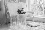 Beautiful wedding bouquet of white roses and orchids on an old classic white sofa.