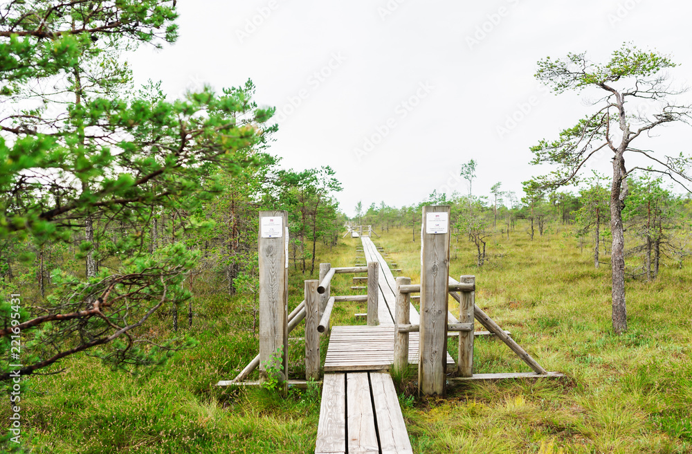 Raised bog. Boardwalk in the forest. Kemeri National park. Latvia.
