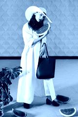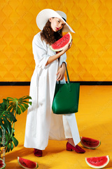 Full-length studio fashion portrait of young beautiful model wearing long white trench coat, wide-brimmed hat, pink loafers, holding green faux-leather shopper bag, posing on yellow background
