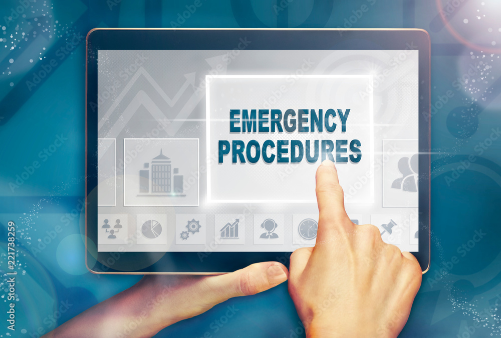A hand selecting a Emergency Procedures business concept on a clear screen with a colorful blurred background.