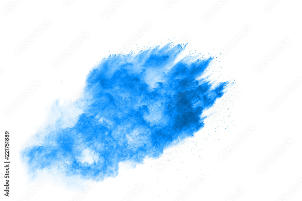 Blue powder explosion on white background. Colored cloud. Colorful dust explode. Paint Holi.