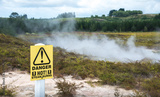 The warning sign pole in geothermal activity area of Crater of the moon in Taupo, New Zealand.