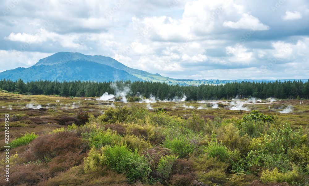 The scenery view of steaming vents in the lunar landscape of Crater of the moon in Taupo, New Zealand.