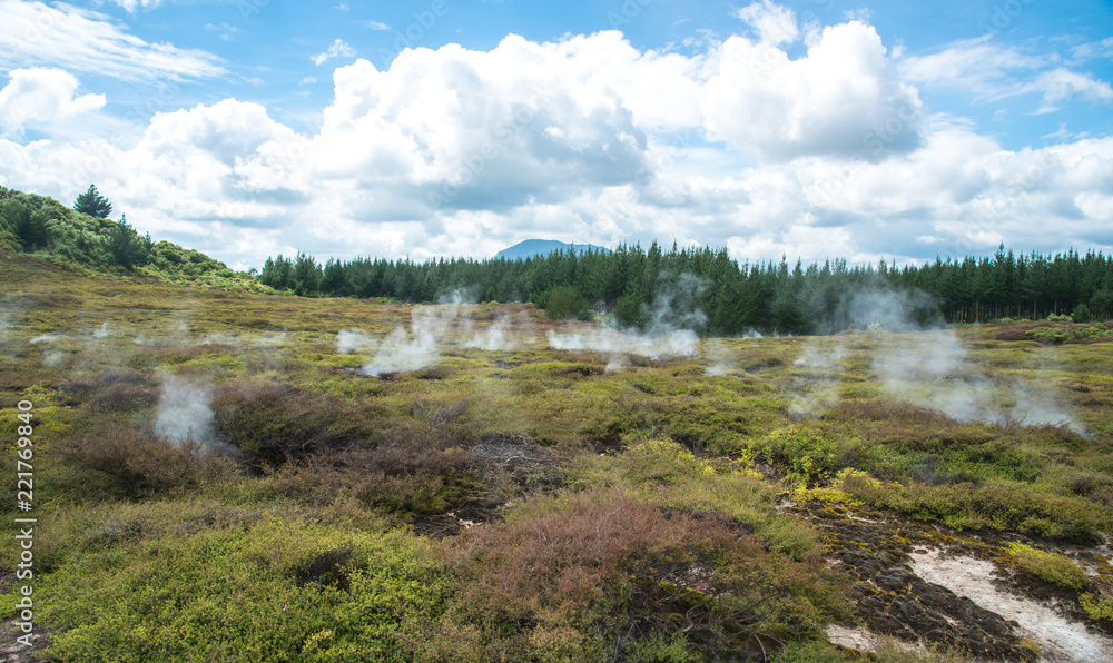 The scenery view of steaming vents in the lunar landscape of Crater of the moon in Taupo, New Zealand.