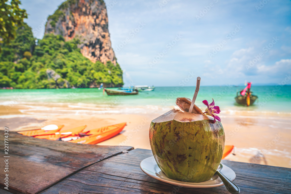 Coconut fruit drink at beautiful Tropical Beach blue ocean background with Traveler items vacation travel accessories for holiday or long weekend a guide choice idea for planning travel
