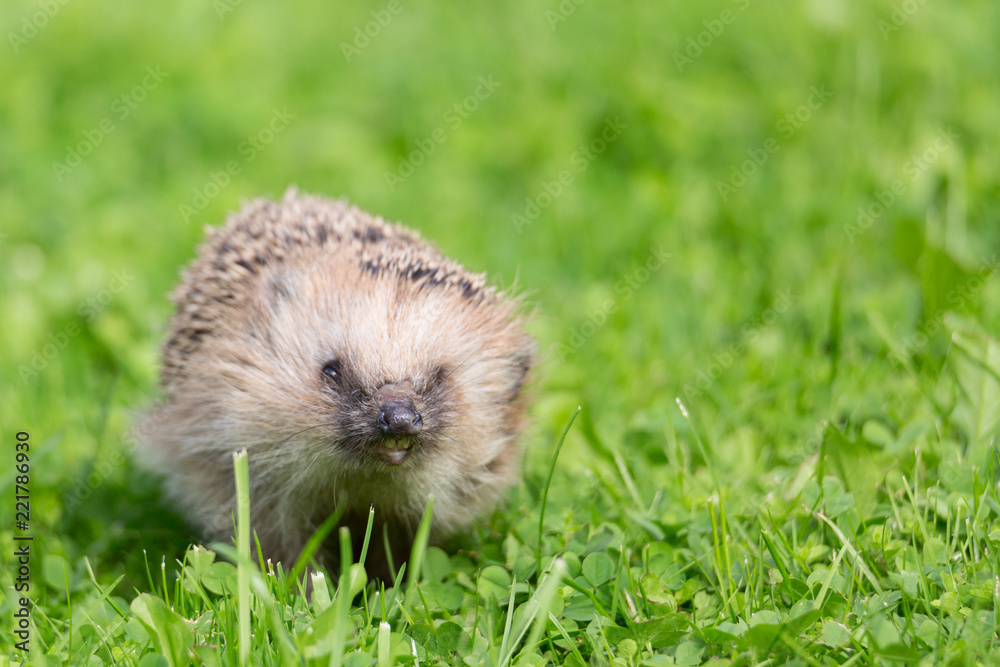 Close up portrait of small European hedgehog on green grass. Erinaceus europaeus.