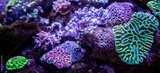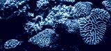 Underwater coral reef landscape background in the deep lilac ocean