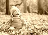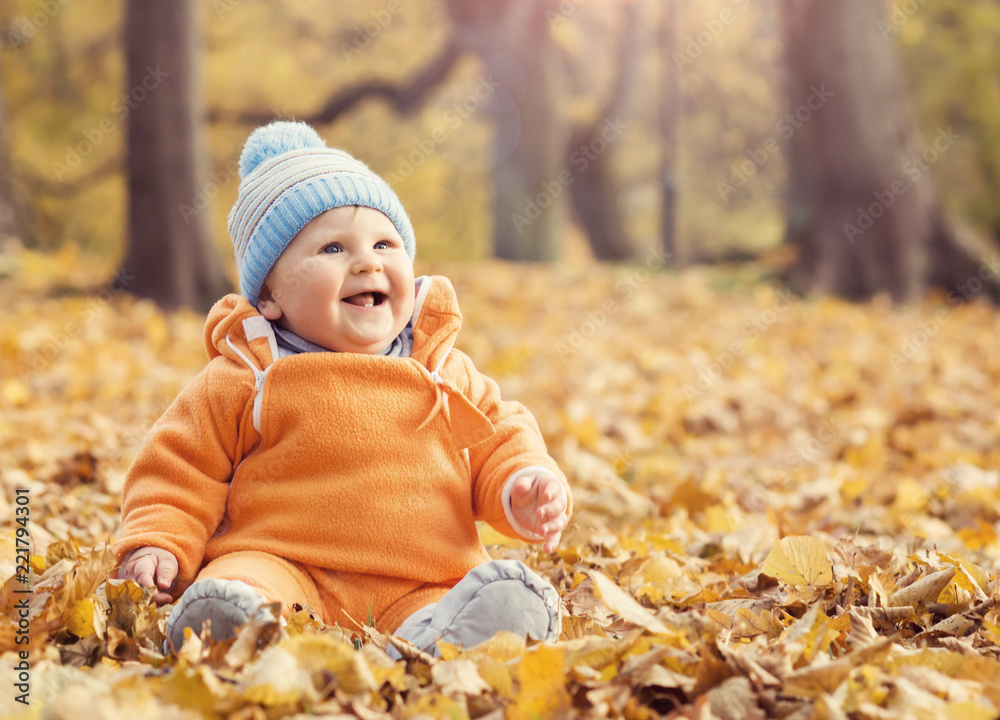 Happy toddler baby playing with leaves in autumn park.