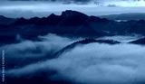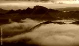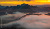wonderful, beautiful sunset in the mountains. The fogs were illuminated by the setting sun