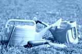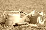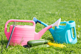 Gardening concept. Colorful watering cans with gardening tool and marrows on green grass.