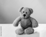 Black and white photo of teddy bear sitting alone on white table with yellow background, One brown bear toy with with copy space