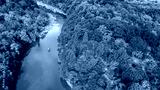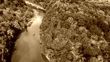 Aerial view boat on the river bring tourist people to enjoy autumn colors along katsura river to Arashiyama mountain area during fall season in Arashiyama, Kyoto, Japan.