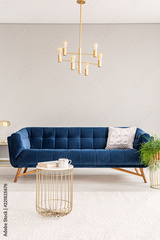 Minimal living room interior with a dark blue sofa and gold metal chandelier and a coffee table. Empty copy space wall. Real photo.