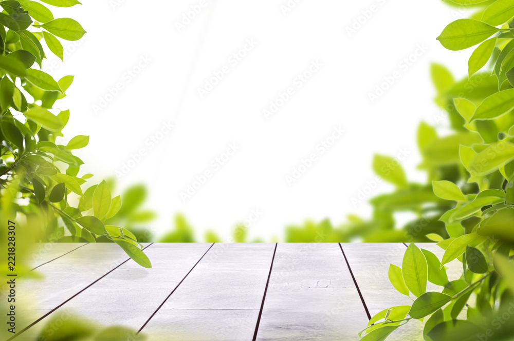 wooden table top with spring green leafs as frame