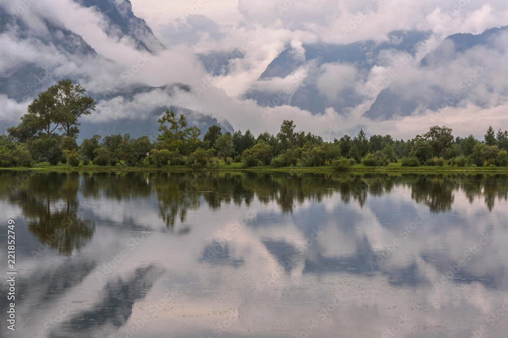 lake clouds fog mountains reflections