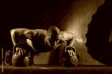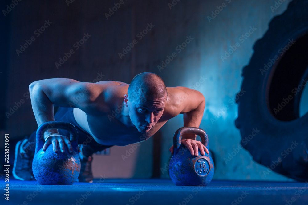 Man with kettlebell weights exercise in the fitness gym. Crossfit training workout. Sports functional training. Weightlifting workout. Sports, cross fit, fitness concept. Strength and motivation