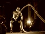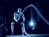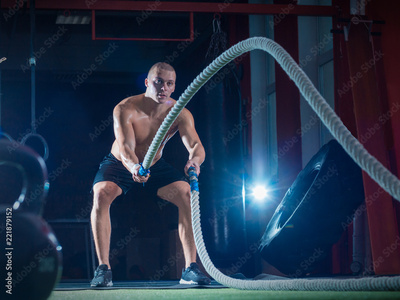 Young man working out with battle ropes. Sports exercise in the fitness gym.