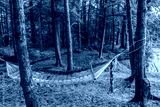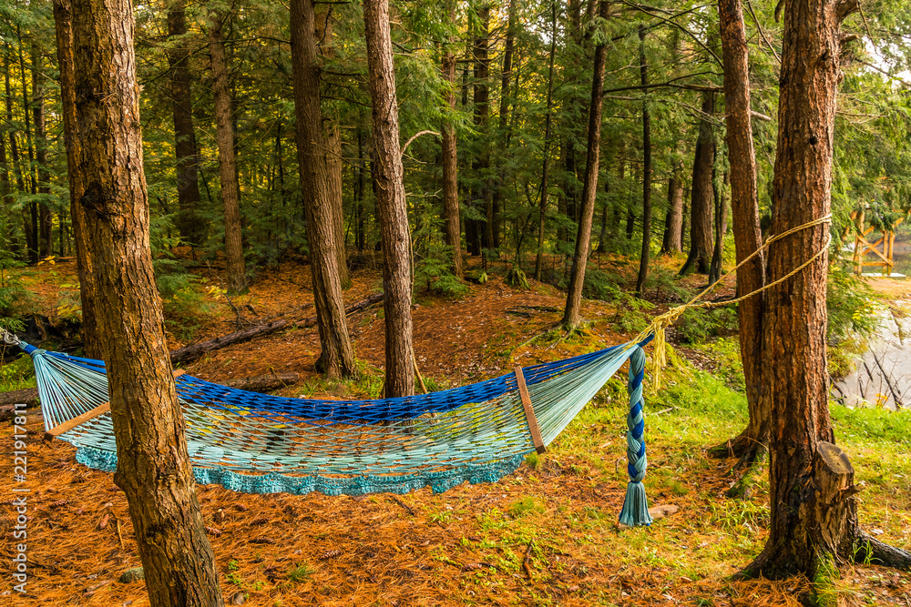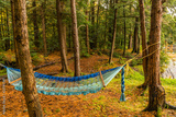 A colorful rope hammock in autumn woods near a river, cool weather, foliage in fall colors, wanderlust concept