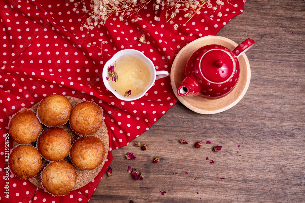 banana cup cake with a cup of tea and red tea pot on wooden table