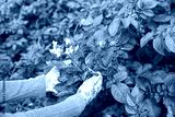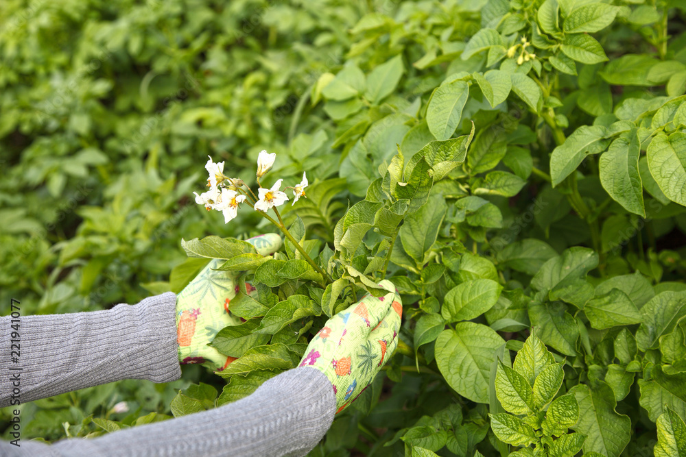 The gardener mulches the dry grass potatoes, plant sprouts in the open ground. Organic vegetable growing on your personal plot.