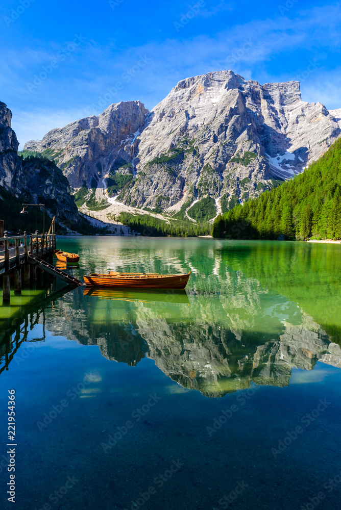 Lake Braies (also known as Pragser Wildsee or Lago di Braies) in Dolomites Mountains, Sudtirol, Italy. Romantic place with typical wooden boats on the alpine lake. Hiking travel and adventure.