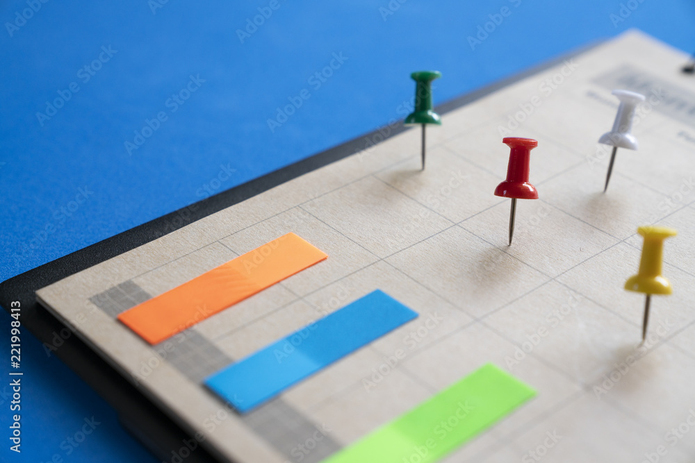 close up of calendar, planner and pin on the blue table, planning for business meeting or travel planning concept