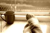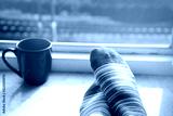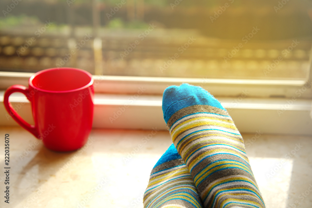 feet with blue knitted socks on the window and blur red cup of coffee in the morning background